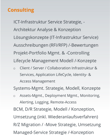 Consulting 	ICT-Infrastruktur Service Strategie, -Architektur Analyse & Konzeption 	Lösungskonzepte (IT-Infrastruktur Service) 	Ausschreibungen (RFI/RFP) /-Bewertungen  	Projekt-Portfolio Mgmt. & -Controlling  	Lifecycle Management Modell /-Konzepte o	Client / Server / Collaboration Infrastruktur & Services, Application LifeCycle, Identity- & Access Management  	Systems-Mgmt. Strategie, Modell, Konzepte o	Assets-Mgmt., Deployment Mgmt., Monitoring, Alerting, Logging, Remote-Access 	BCM, D/R Strategie, Modell / Konzeption, Umsetzung (inkl. Wiederanlaufsverfahren) 	R/Z Migration / -Move Strategie, Umsetzung 	Managed-Service Strategie /-Konzeption
